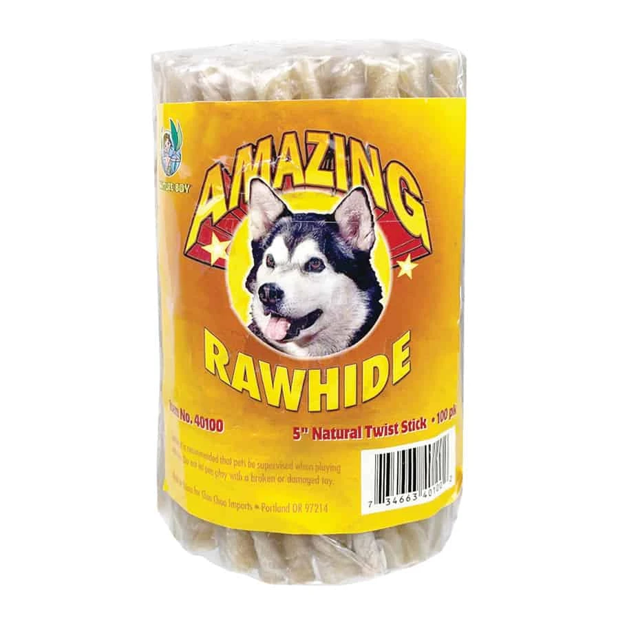 100 pack of rawhide sticks in a clear plastic container. A long lasting rawhide chew to satisfy your dogs urge to chew.