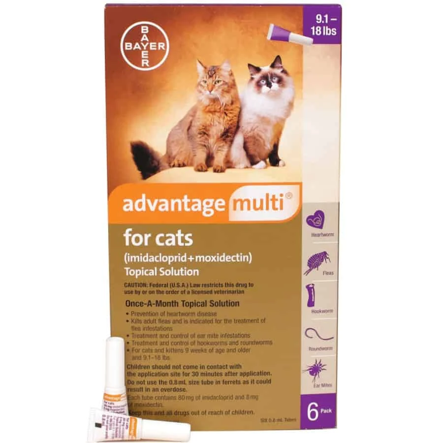 Advantage Multi for Cats is indicated for the prevention of heartworm disease caused by Dirofilaria Immitis in cats and ferrets 2 pounds or over. Advantage Multi for Cats kills adult fleas (Ctenocephalides felis) and is indicated for the treatment of flea infestations.