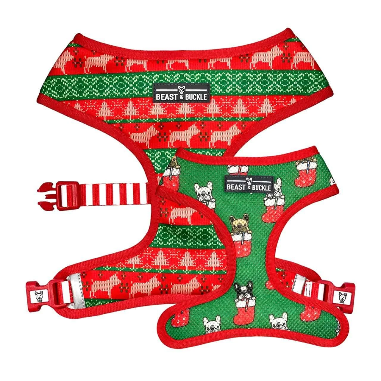 With this reversible dog harness, two is definitely better than one! This stylish holiday print harness features a red and green quilted pattern on the front and an adorable Christmas dog pattern on the back. Made with quality, washable material and easy to snap clips. A robust metal leash anchor completes the great functionality and durability of this harness.