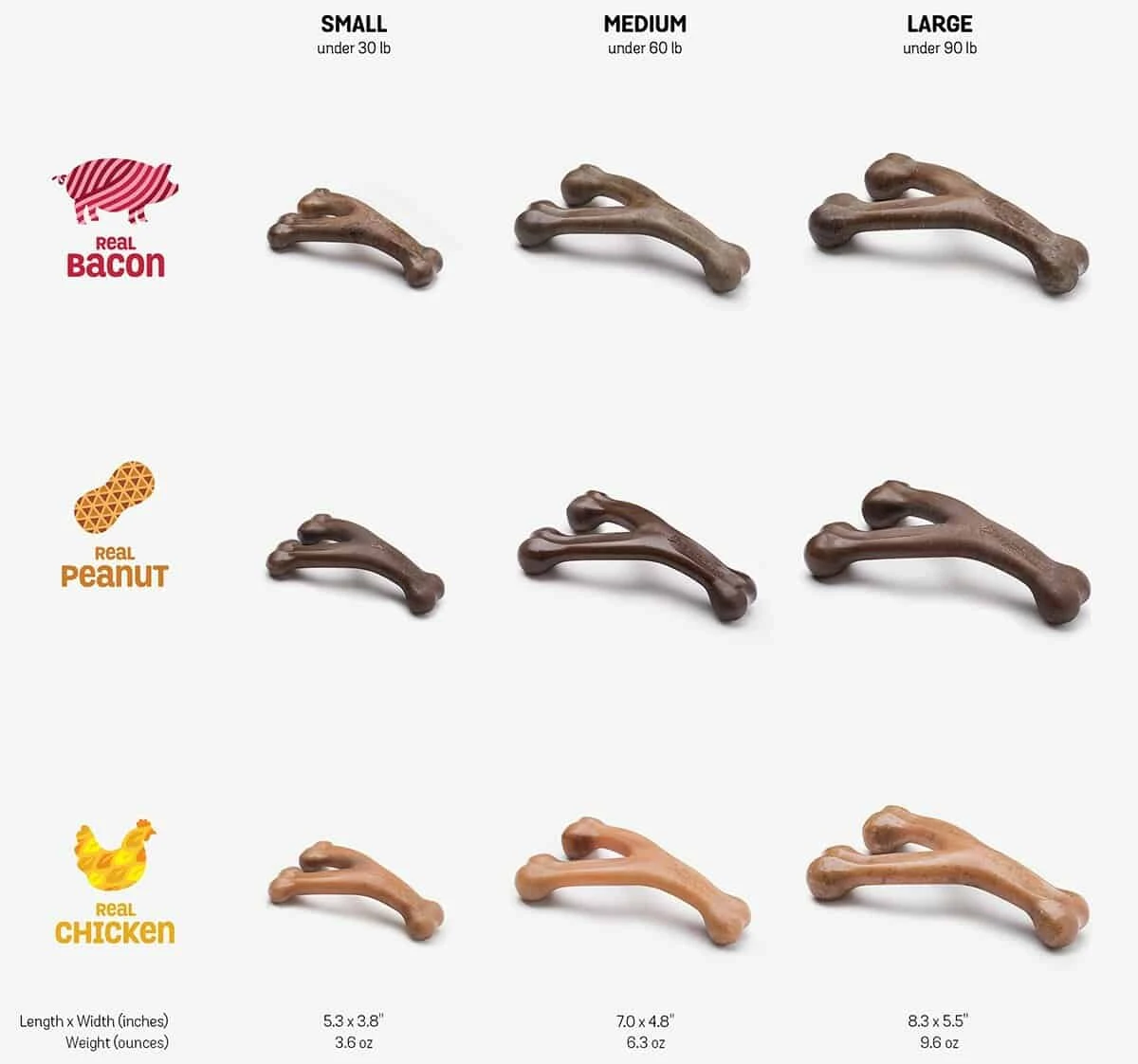 It’s important to choose the proper size chew for your pet based on their weight. Use the size directions below to make your choice before purchase. Happy Chew-sing!