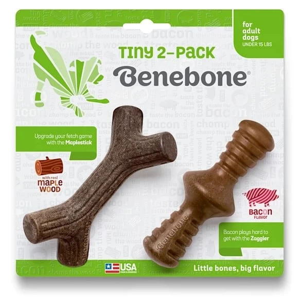 Benebone Zaggler and Maplestick Chews are durable toys made of super-strong nylon and feature tasty natural flavors. The Tiny size is ideal for toy and small size dogs. The custom shape of this chew toy promotes dental health during playtime. Every Benebone product is made and sourced here in the USA.