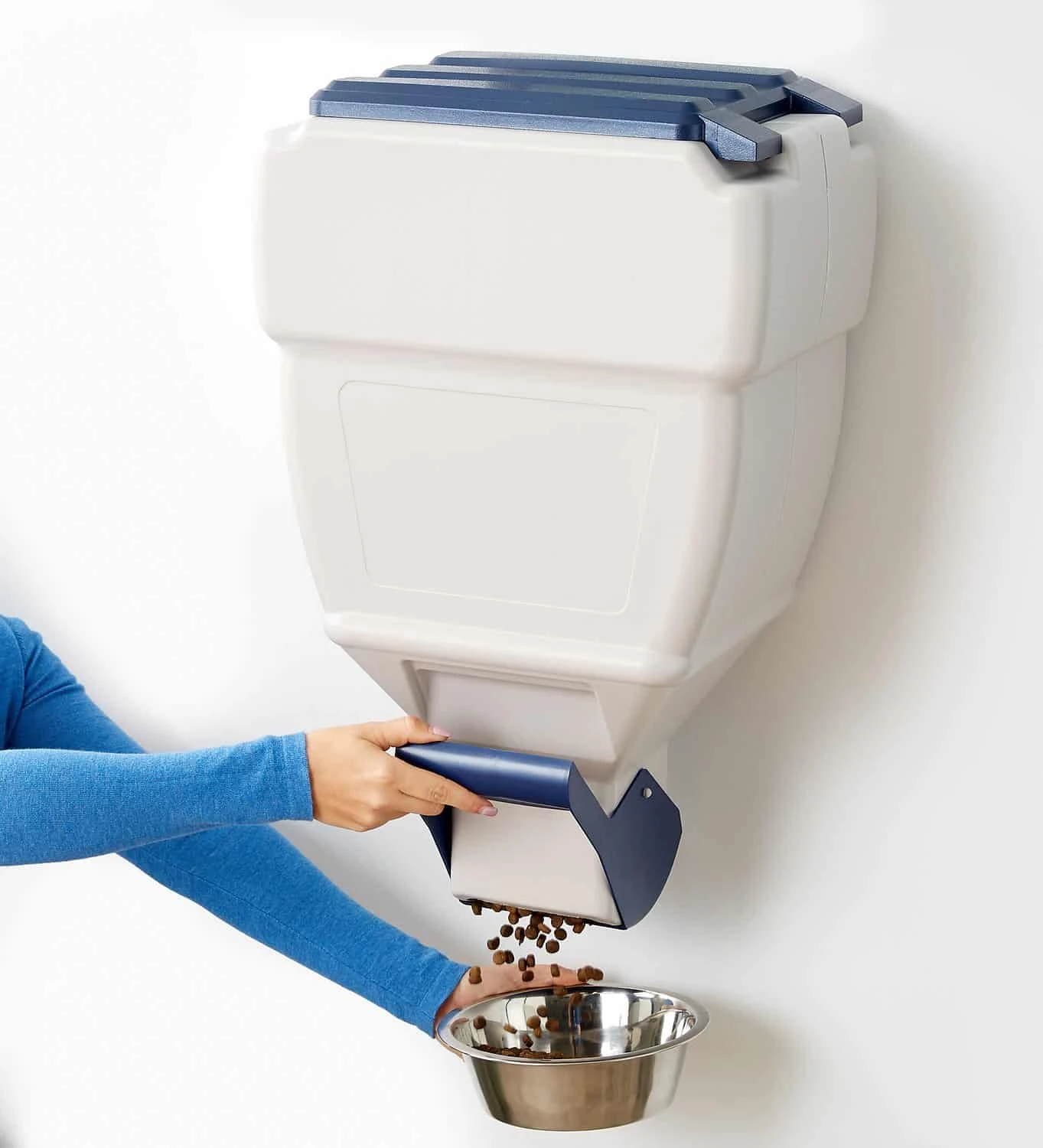 - The Bergan Wall Mounted Dispenser is a functional space saving solution to pet food storage. The lid is designed to keep pet food odors out of your home, while keeping food and treats fresh. Wide opening offers easy accessibility for pouring food and the spout is designed for controlled dispensing. Holds up to 40 pounds of dry pet food. Mounts easily to any wall with included hardware and mounting template.