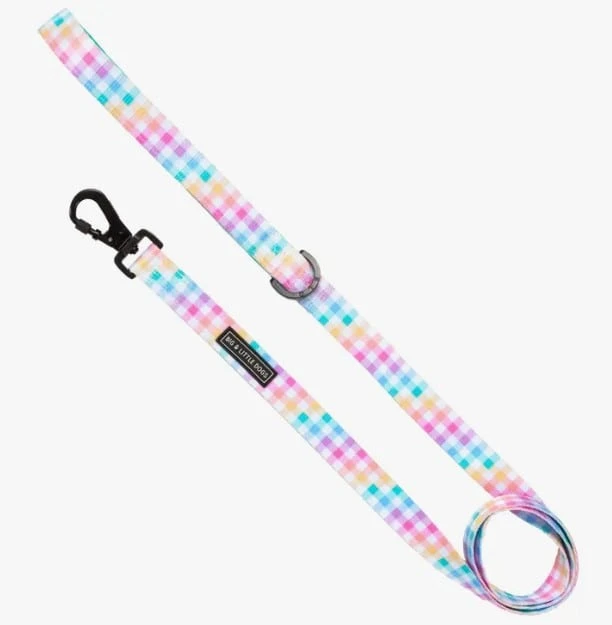 The perfect accessory to match and complement your harness. Designed for comfort and style with a bright and sweet spring colored gingham print. Matching neoprene lined handle for extra comfort. Dual sided polyester webbing strap for durability. Heavy duty swivel snap clip with safety lock (screw up) for attaching to harness or collar. Sturdy D-ring at the base of handle to clip your poop bag holder or attach your keys.
