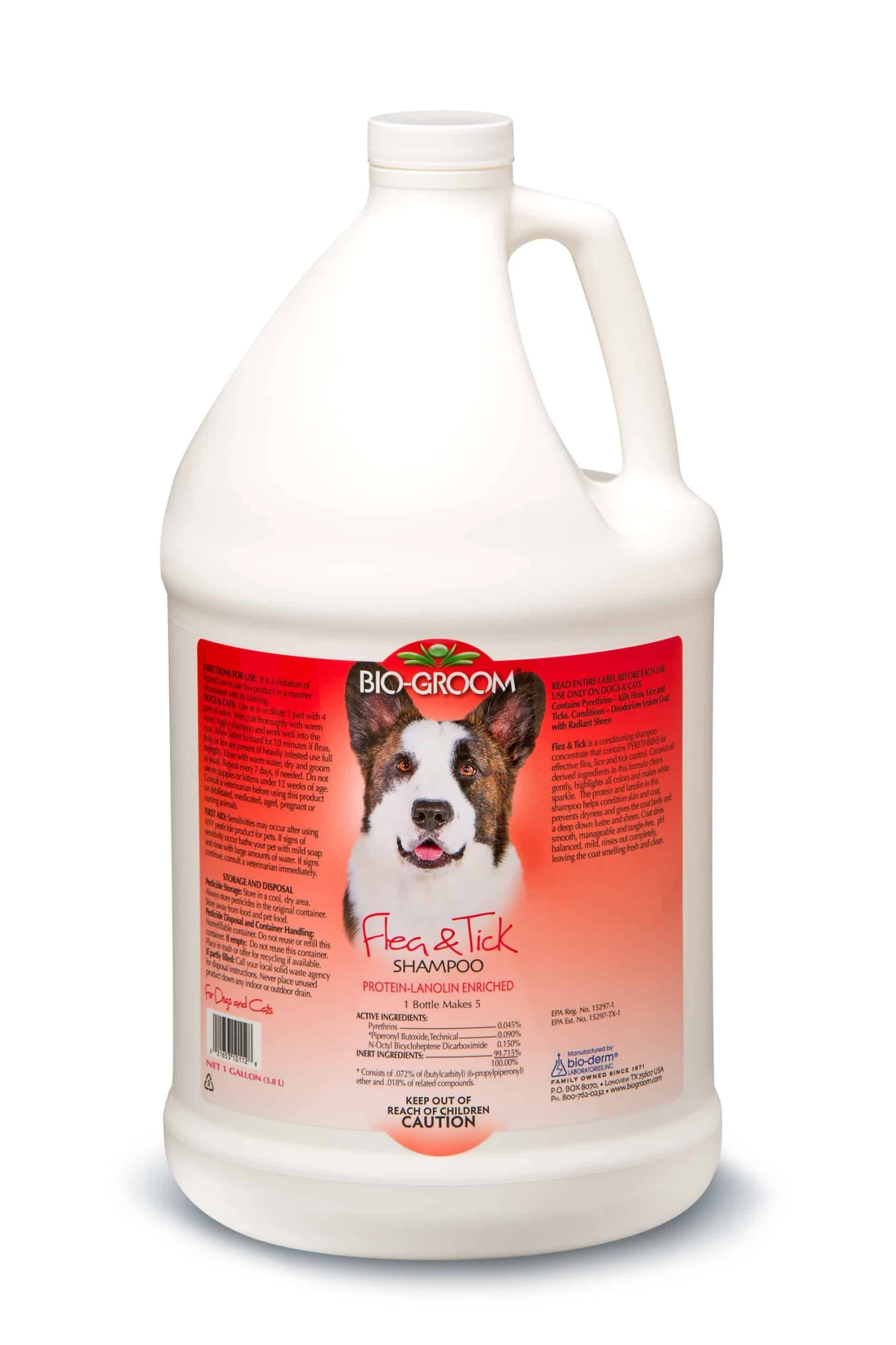 Flea & Tick is a conditioning shampoo concentrate that contains PYRETHRINS for effective flea, lice and tick control. Coconut oil derived ingredients in this formula cleans gently, highlights all colors and makes white sparkle. The protein and lanolin in this shampoo helps condition skin and coat, prevents dryness and gives the coat a deep down lustre and sheen. Coat dries smooth, manageable and tangle-free. pH balanced, mild, rinses out completely, leaving the coat smelling fresh and clean.