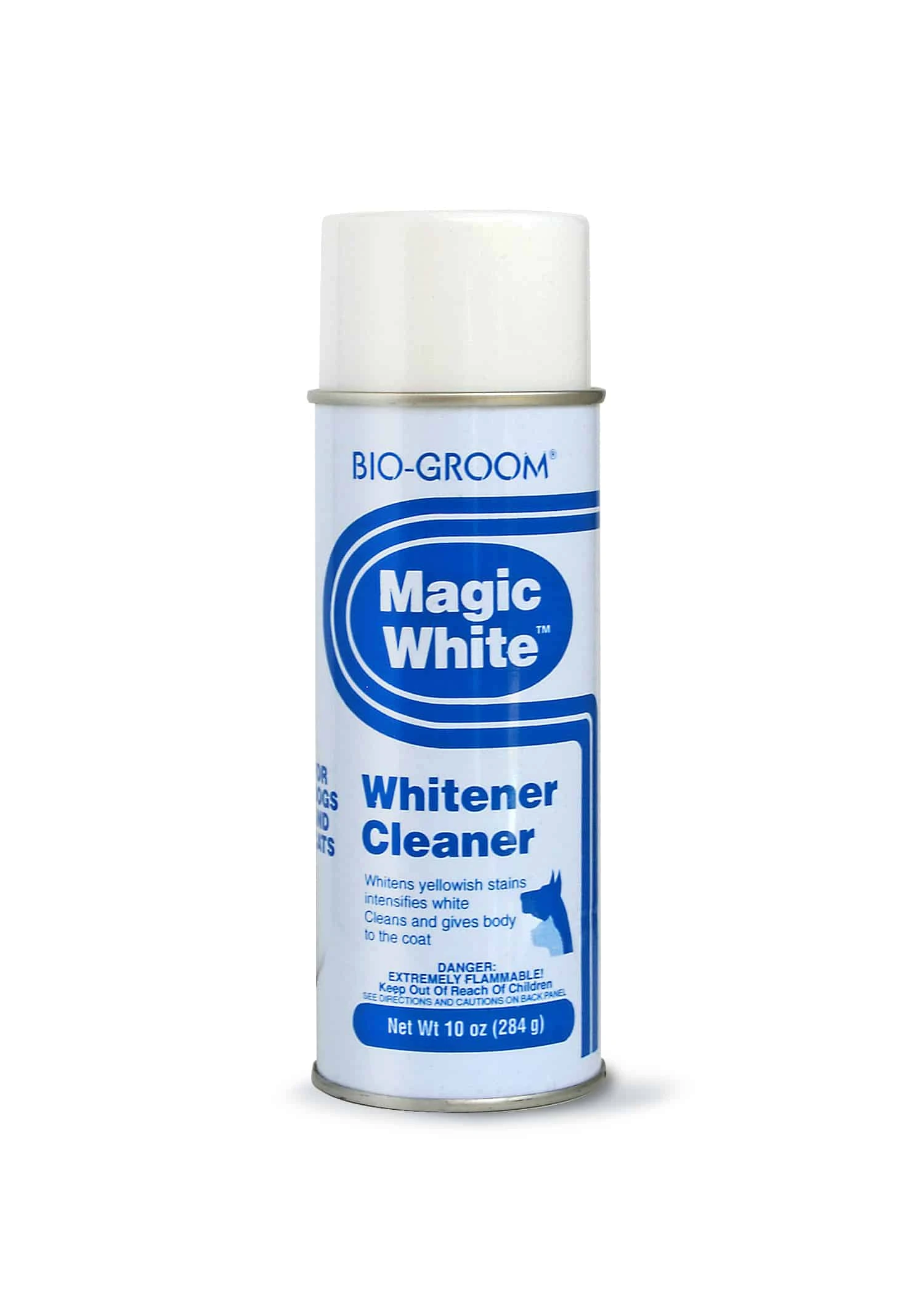 Whitens yellowish stains and intensifies whites. Cleans and gives body to the coat. Aerosol Spray-on chalk.