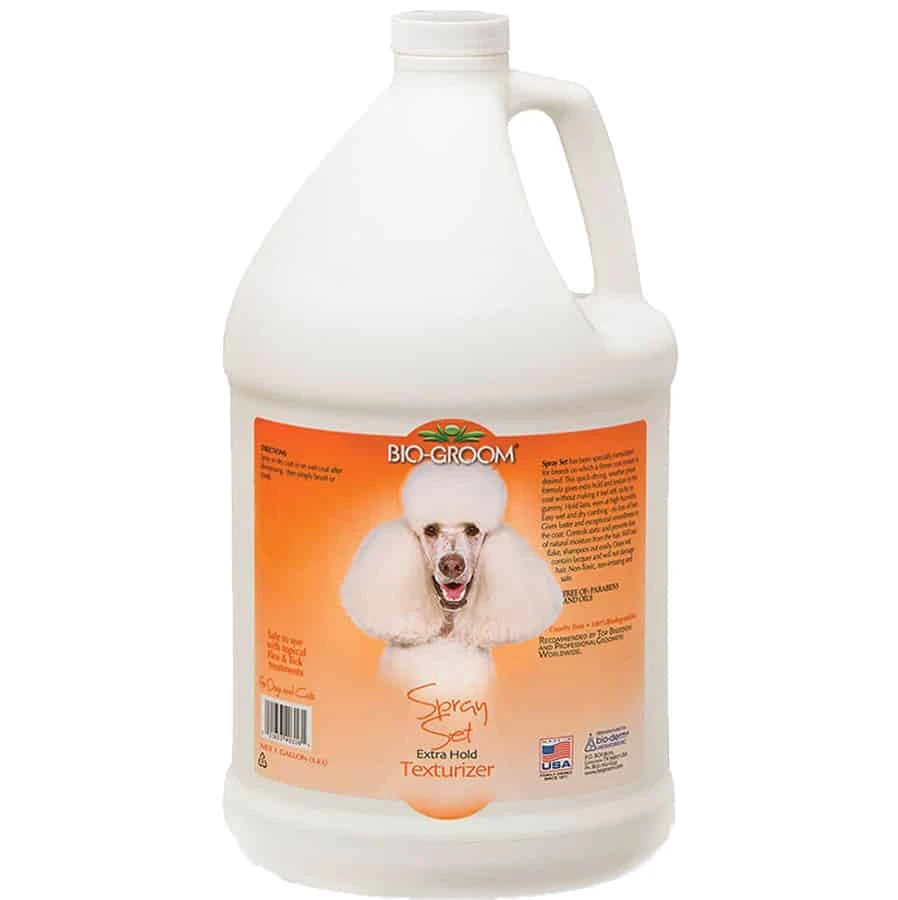 This quick drying formula gives extra hold and texture to the coat without making it feel stiff or tacky. Hold will last even in high humidity. For breeds on which a firmer coat texture is desired, Spray Set™ gives luster and exceptional smoothness to the coat. Controls static and prevents loss of natural moisture from the hair. Will not flake and shampoos out easily. Does not contain lacquer and will not damage the hair. Non-irritating and safe. Easy wet and dry combing.