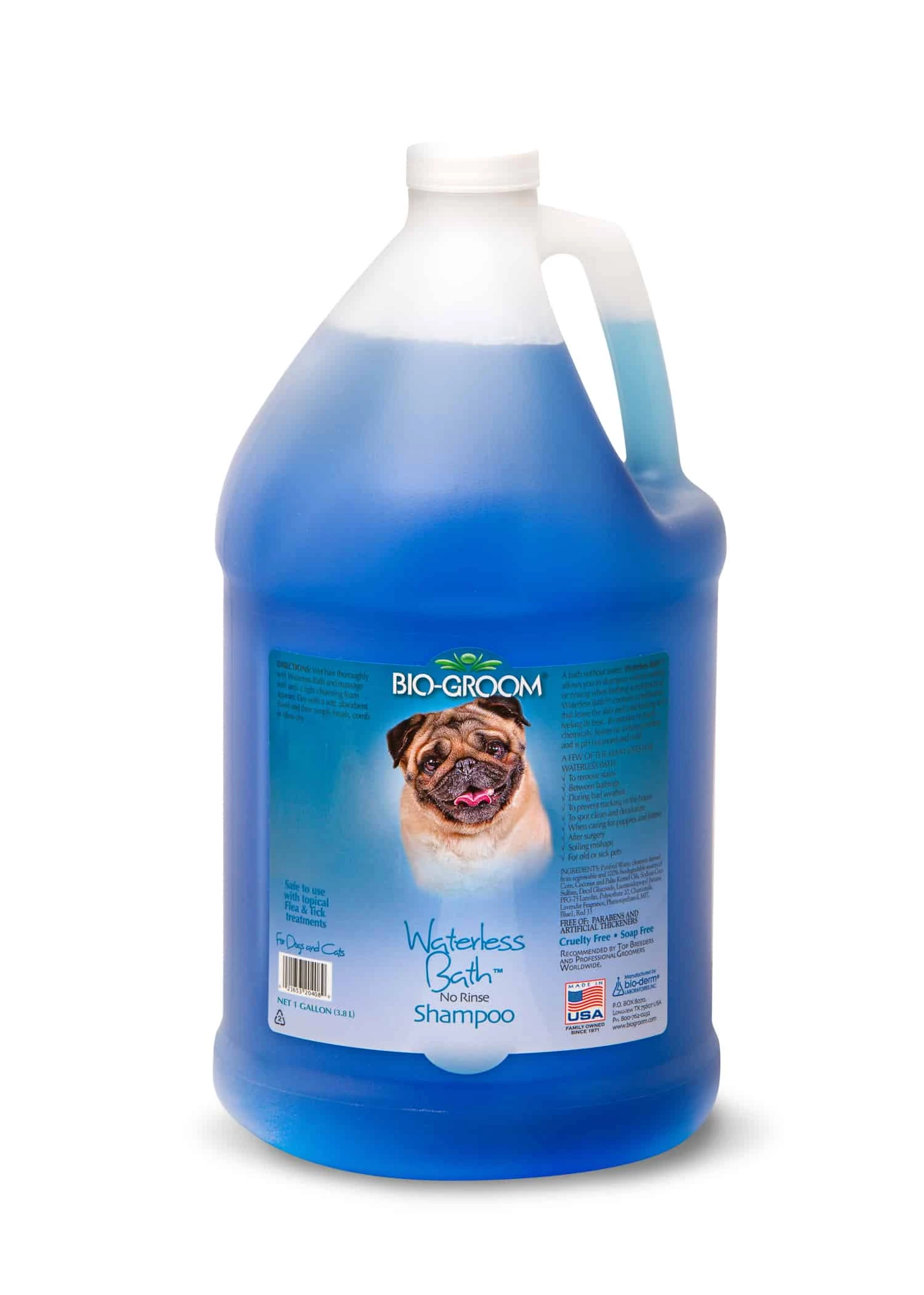 Bio-Groom Waterless Bath Shampoo. A bath without water, Waterless Bath™ allows you to shampoo without wetting or rinsing when bathing is not practical. Waterless Bath™ contains conditioners that leave the skin and coat looking and feeling its best. It contains no harsh chemicals, leaves no irritating residue, and is pH balanced and mild.