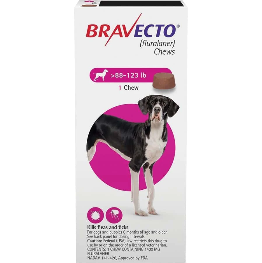 Bravecto chewable tablets are flavored chews for flea and tick control in dogs. One treatment should be administered every 12 weeks. Bravecto chewable tablets kill adult fleas and is indicated for the treatment and prevention of flea infestations, and the treatment and control of black-legged ticks, American dog tick, and brown dog ticks for 12 weeks, and lone star tick infestations for 8 weeks in dogs and puppies 6 months of age and older and weighing 88 – 123 lbs. Bravecto chewable tablets for dogs should be administered with food.