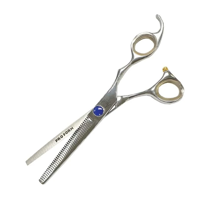 - 46 tooth blender shear by Anvil. Convex Ground, polished, assembled and finished in the USA. Made of Molybdenum 440 Vacuum hardened Stainless Steel. 57+or-1 Rockwell-C Hardness. Short shanks and Dropped/Offset Thumb handle for reduced hand fatigue. 7.5″ Overall Length with a Cutting Length of 3″. Comes with faux leather, zipper case.