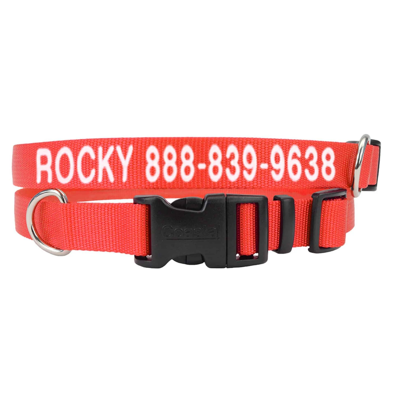 This personalized nylon pet collar is 3/4″ wide and adjustable from 14″- 20″. Your pets name & phone number will be embroidered with white thread.