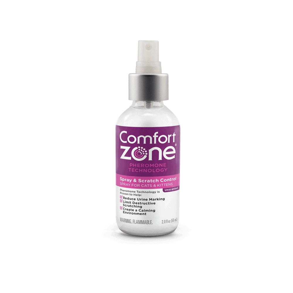 Comfort Zone Spray & Scratch Control Spray for Cats & Kittens reduces urine marking and unwanted scratching. May also help calm during vet visits or during travel.