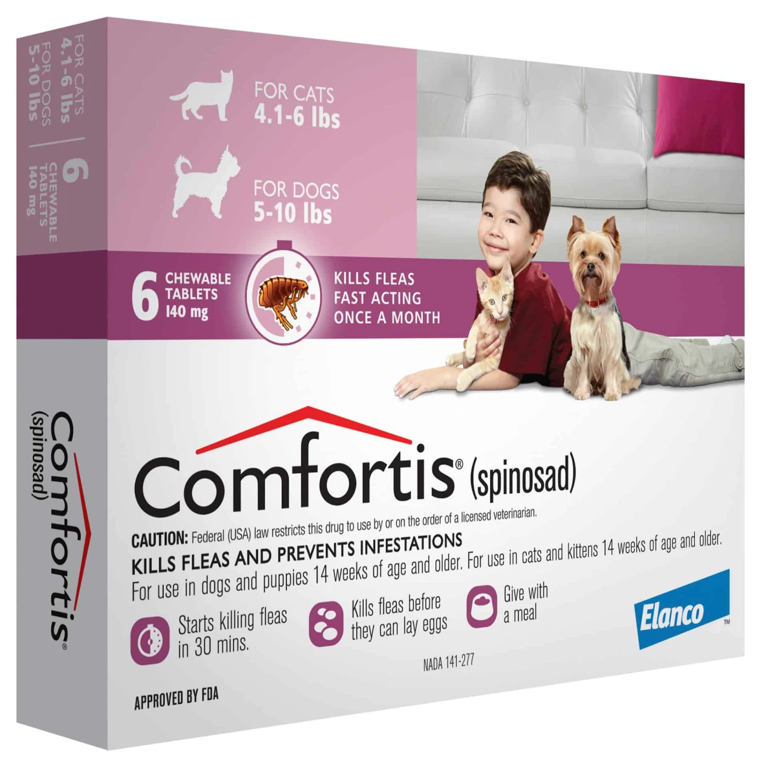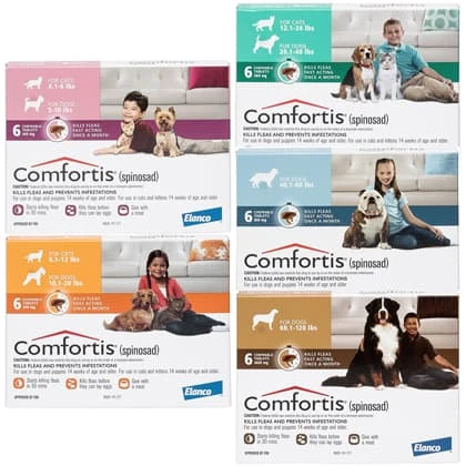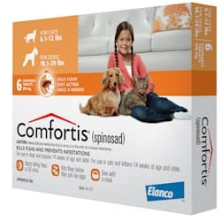 Comfortis is for both dogs and cats. It’s approved for use in cats 14 weeks of age or older and 4.1 pounds of body weight or greater. It’s approved for dogs 14 weeks of age or older and 5.0 pounds of body weight or greater.