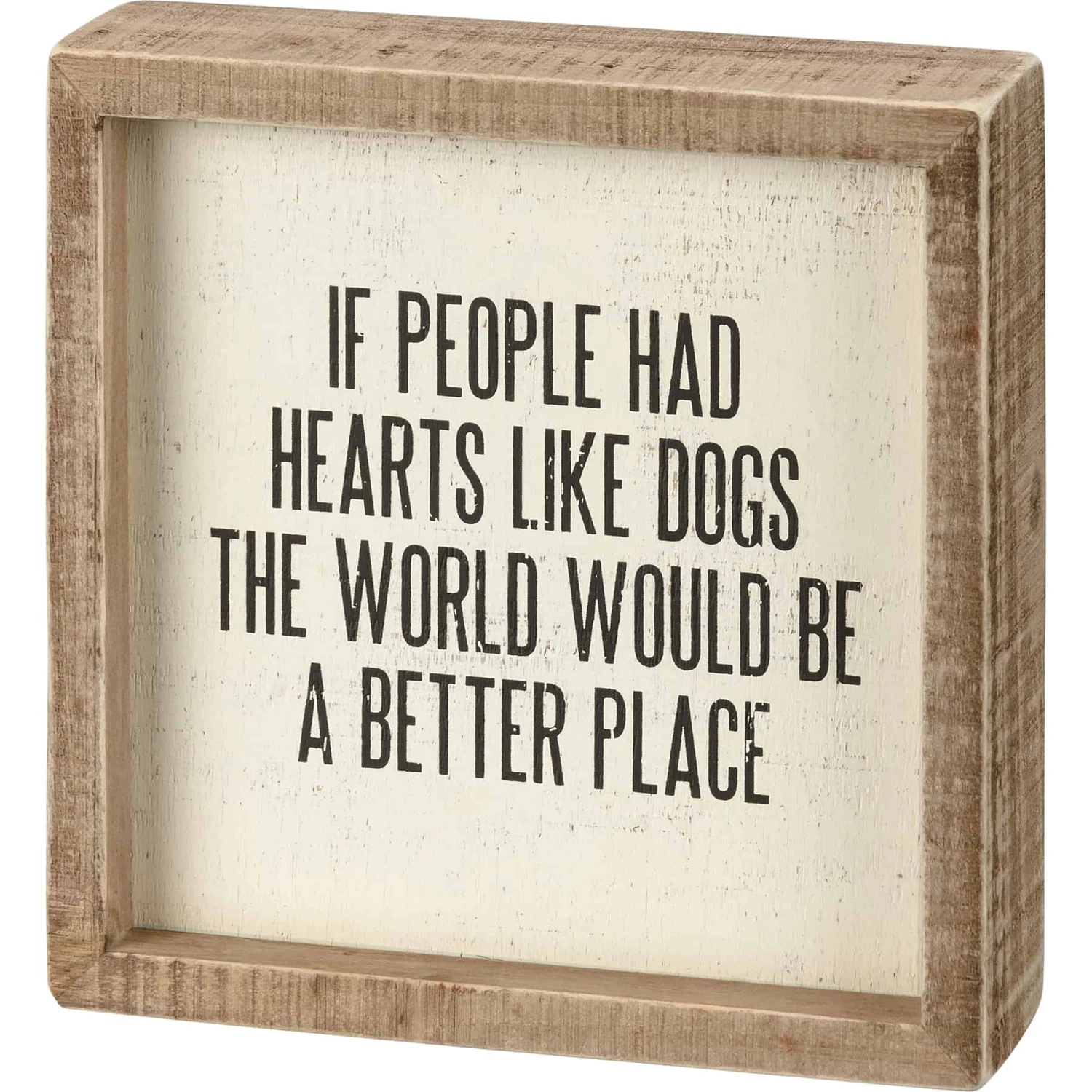 An inset wooden box sign featuring “If People Had Hearts Like Dogs The World Would Be A Better Place” sentiment. Easy to hang or can free-stand alone.