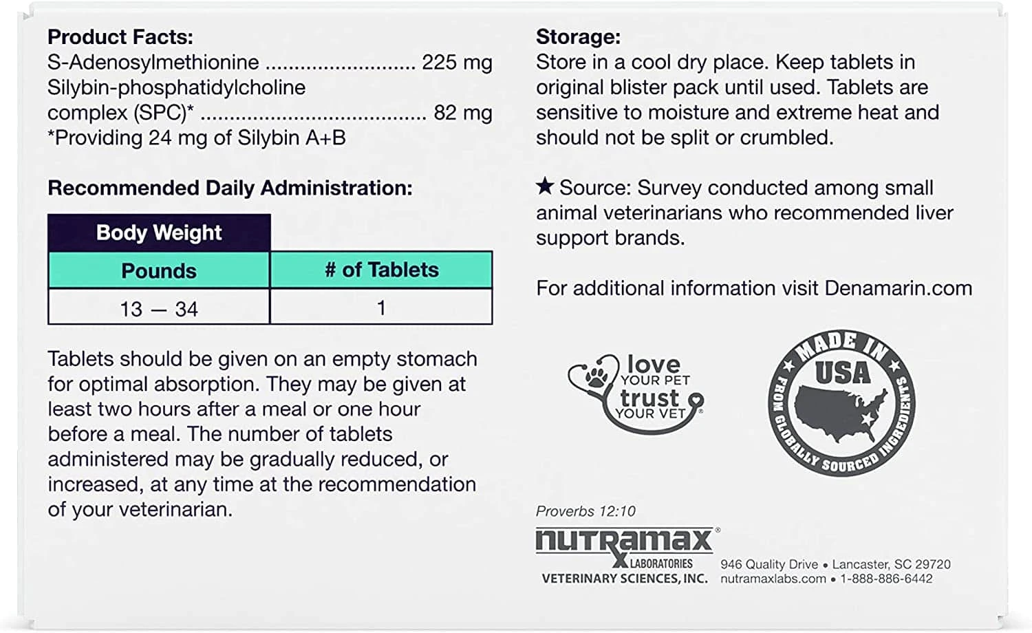 - Denamarin is the #1 veterinarian recommended liver support supplement for dogs. This supplement contains s-adenosylmethionine (SAMe) to help increase levels of the antioxidant glutathione – one of the liver’s main detoxifying agents. The Silybin found in Denamarin has shown better absorption by dogs than the standardized milk thistle extract found in many other products. The liver is one of the most vital organs in your pet and is responsible for removing toxins, storing energy, aiding digestion, and supporting the immune system.
