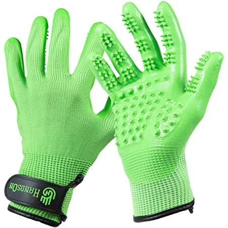 HandsOn® Gloves are an innovative concept in bathing and grooming your horses, dogs and other animals. The unique scrubbing nodules on the fingers and palms massage the animal’s muscles, stimulate circulation, and distribute natural oils for healthy skin and coat. They are tough enough to scrub caked mud off the body, yet gentle and flexible enough to use on face and legs and more sensitive, contoured places. These gloves can be used wet or dry and will not slip off when soapy. They’re also great for shedding, as hair won’t stick to the gloves.