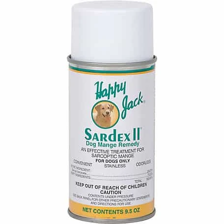 Happy Jack Sardex is perhaps the most technologically advanced treatment for mange Happy Jack offers this odorless, grease-less, and stainless aerosol treatment is federally-approved for the treatment of mange mites on dogs.