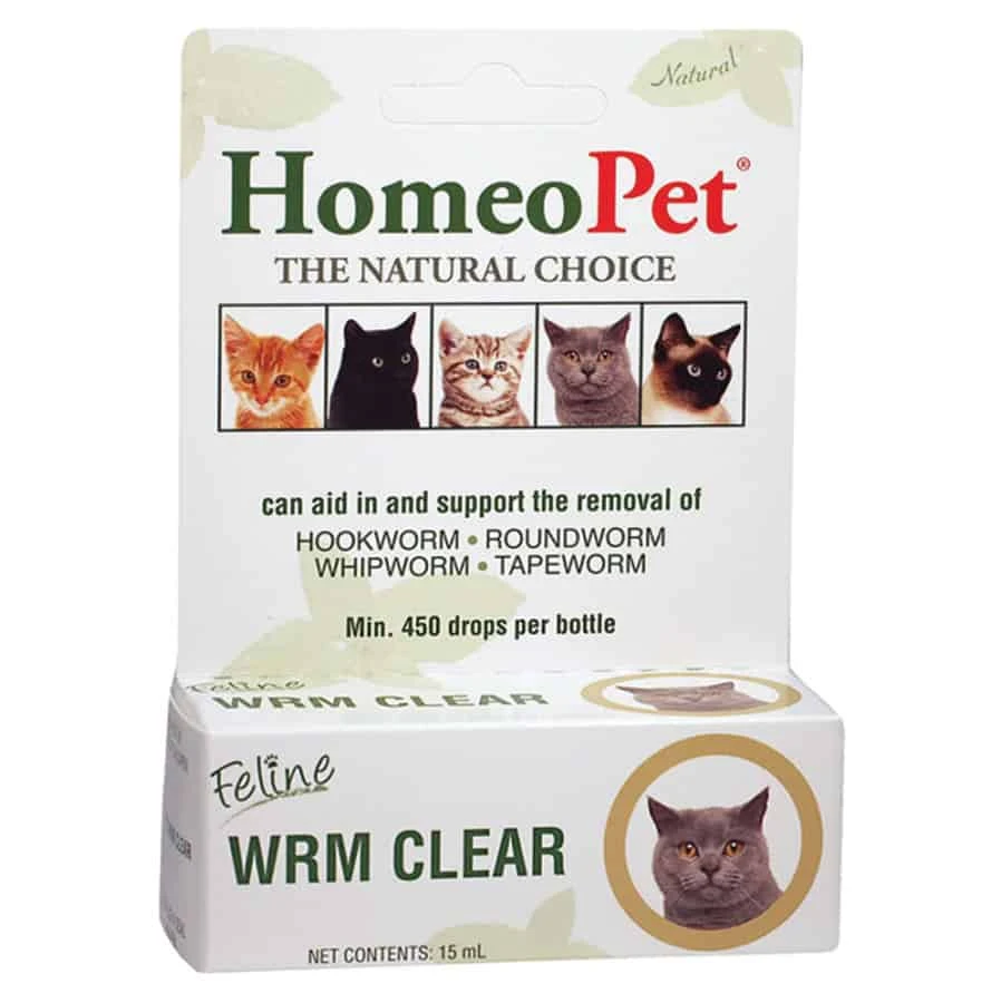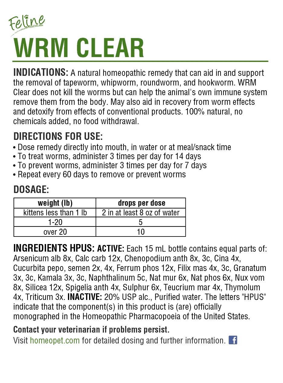 Can aid in and support the removal of tapeworm, whipworm, roundworm, and hookworm in felines. WRM Clear does not kill the worms but can help the animal’s own immune system remove them from the body. May also aid in recovery from worm effects and detoxify from effects of conventional products. Natural pet medicine, no food withdrawal required.