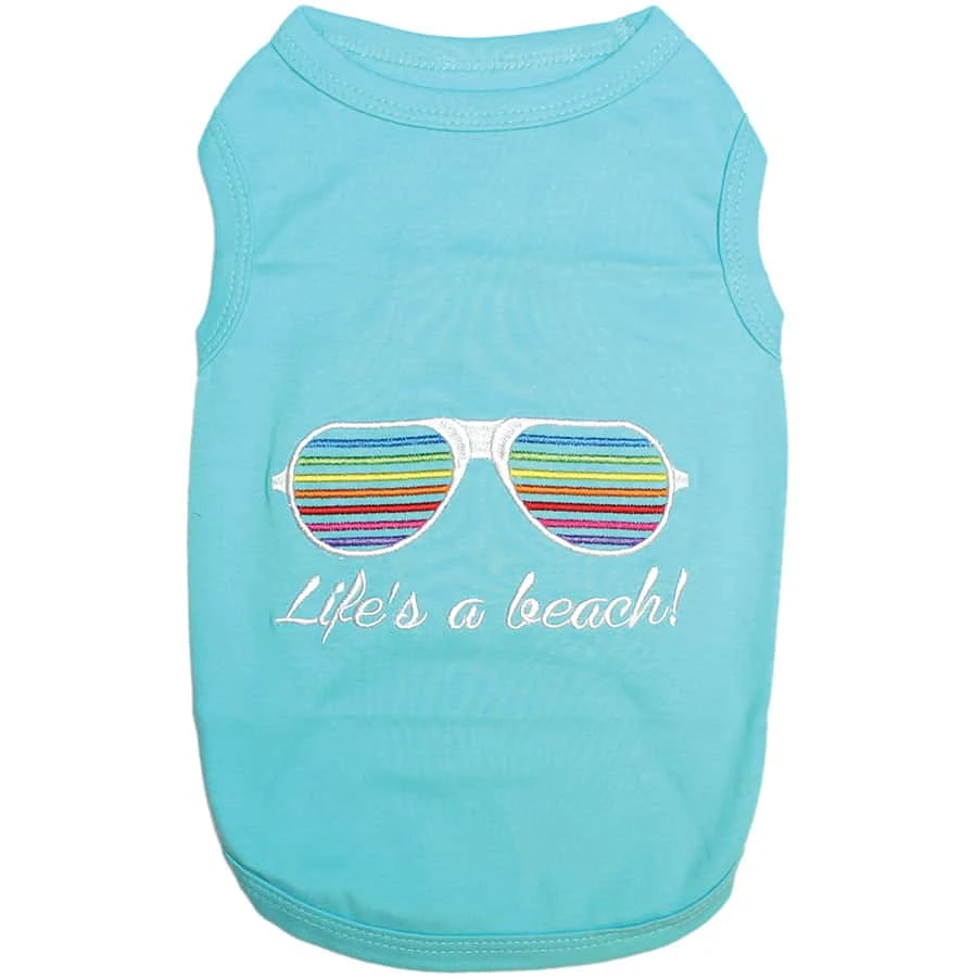 Designed with a stunning color palette and charming details, this summer vibe blue “Life’s a Beach” dog t-shirt will make your pooch stand out from the crowd. The eye-catching embroidery features a pair of sunglasses with multi-colored stripes and white lettering in an elegant font, all in a stunning contrast with the light blue cotton material. Manufactured from 100% cotton, this adorable tee will ensure your pup feel comfortable at all times. Will fit numerous types of breeds, from tiny tea cup to Standard Poodle and dogs of up to 50 lbs.