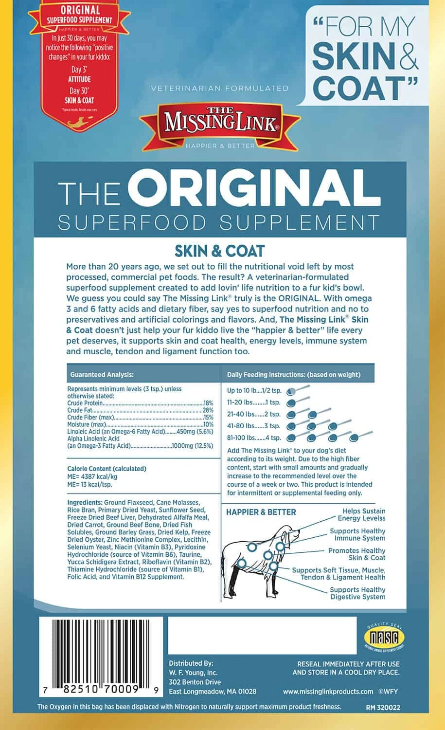 Pup’s coat looking a little dull or skin itching? Add a daily helping of The Missing Link® Original Ultimate Canine Skin & Coat to your fur kiddo’s bowl. With just a scoop of this powdered superfood supplement, add essential Omega 3 and 6 fatty acids, dietary fiber and phytonutrients to support your pet’s skin, coat, and immune system. And, with the absorption power of Omega fatty acids, The Missing Link® Original Ultimate Canine Skin & Coat supports your pet’s muscle and tendon function, energy levels and overall health and happiness. Not bad for just a spoonful.