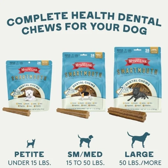 Smartmouth’s unique features and powerful 7-in-1 formula makes it the only dental chew that deeply cleans teeth, freshens dog breath and supports gum health while providing a daily vitamin supplement to support your dog’s whole body wellness – all in one delicious healthy dog treat.