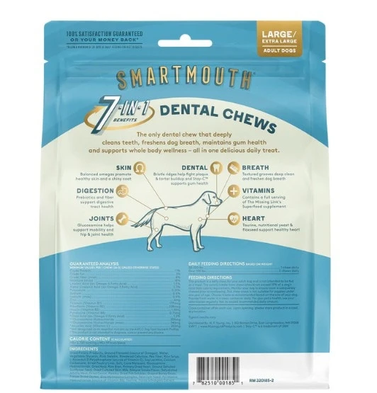 Smartmouth’s unique features and powerful 7-in-1 formula makes it the only dental chew that deeply cleans teeth, freshens dog breath and supports gum health while providing a daily vitamin supplement to support your dog’s whole body wellness – all in one delicious healthy dog treat.