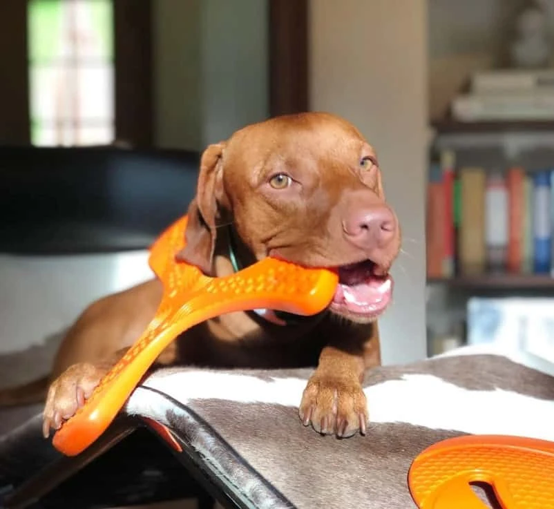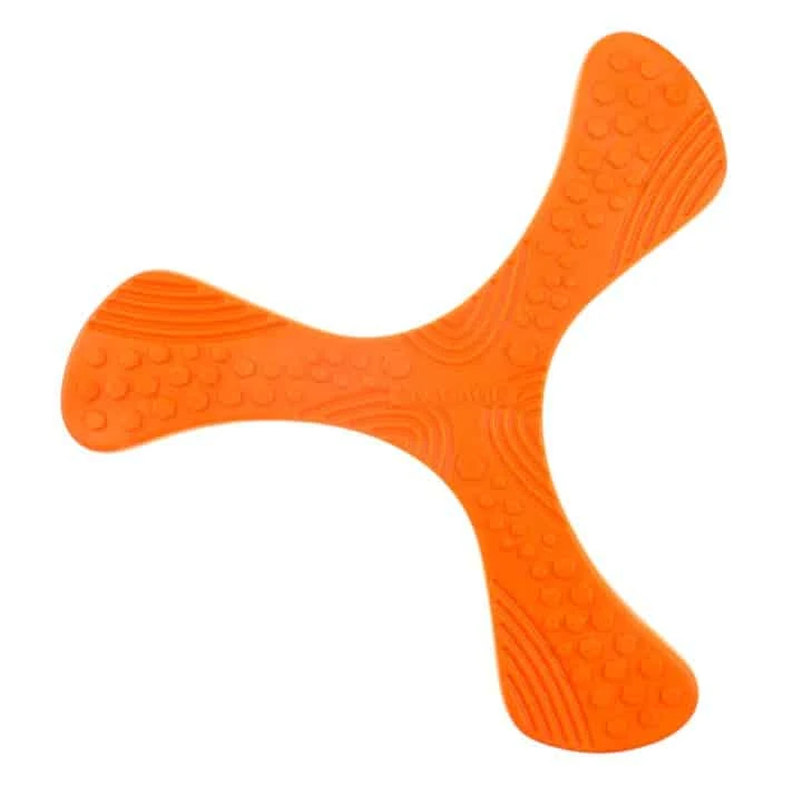 The TPR N-Gage Propeller rubber dog toy is durable enough for hard play, yet flexible enough for high bounces. Triple spoke design provides fast erratic bounces when tossing on land ramping up interactive play time. A vibrant orange color makes it easy to spot from long distances.