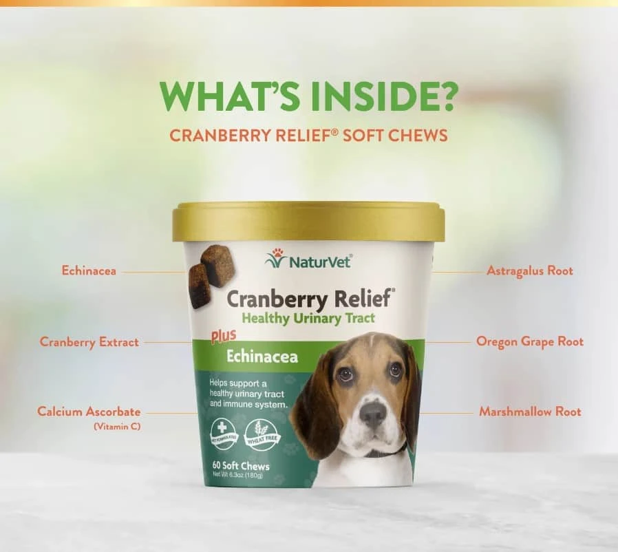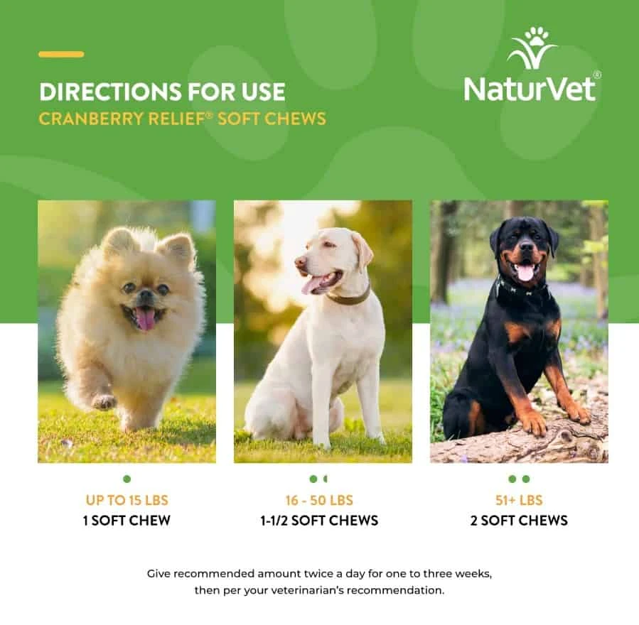 NaturVet® Cranberry Relief® Dog Urinary Soft Chews is for use in dogs over the age of 12 weeks. Helps support a healthy urinary tract and provides immune support to help maintain overall health.