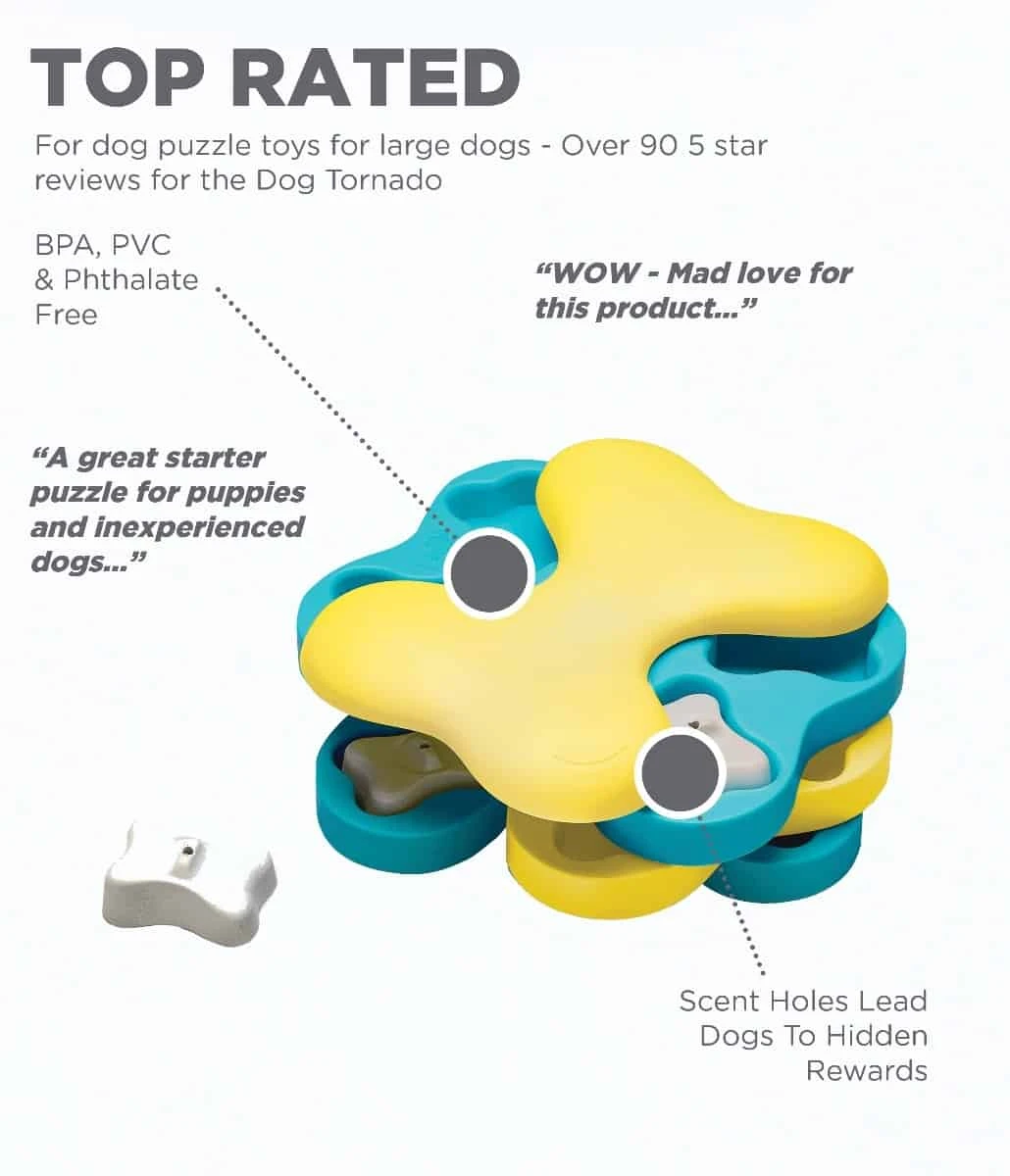- INTERMEDIATE DOG PUZZLE: Exercise your dogs mind with the interactive level 2 Dog Tornado puzzle toy. This engaging dog treat dispenser provides a fun physical & mental challenge. Your pup will need to learn how to combine multiple steps to retrieve the hidden treat.
