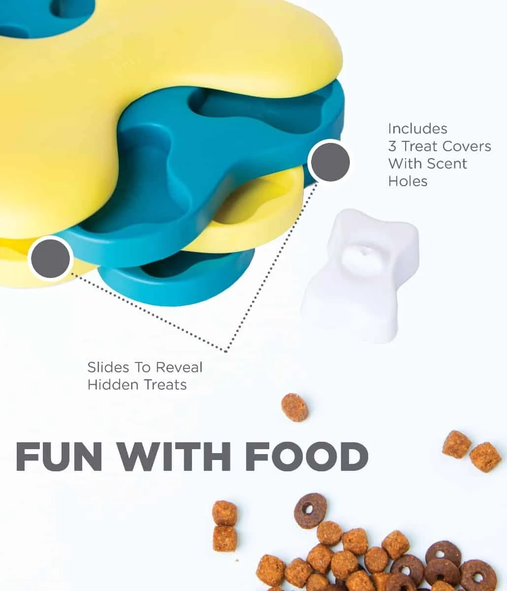 The Dog Tornado level 2 interactive dog puzzle from Nina Ottosson is the ideal toy for bored dogs and will keep them occupied for hours! This intermediate level toy features three tiers with twelve compartments for dog snacks or kibble. This mentally stimulating and entertaining dog game encourages your pup to spin the interactive puzzle tiers to reveal the rewards. The three bone shaped covers can be used to increase the difficulty! Made of BPA, PVC & phthalate-free material that can be hand washed between each use with warm water and soap.