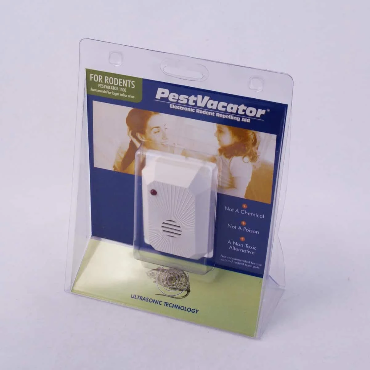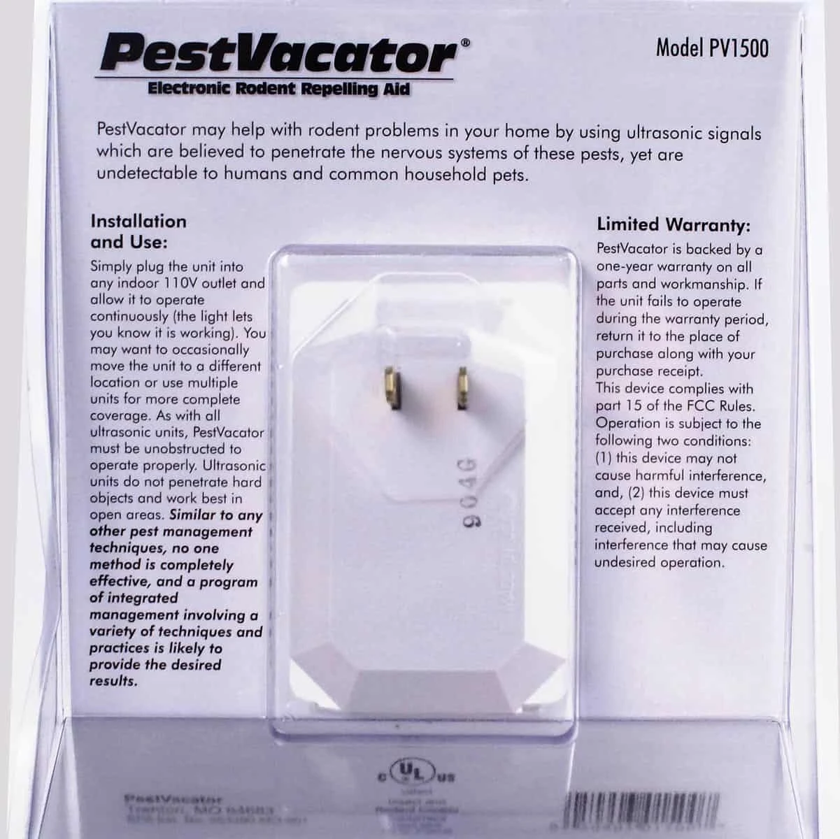 The PestVacator® 1500 is an electronic device that utilizes ultrasonic technology and is recommended for use in larger indoor areas as an alternative for people that do not want to use chemical solutions within their homes. For the ultrasonic technology feature to work, plug the unit into any unobstructed 110V outlet within the home where pests are a problem.
