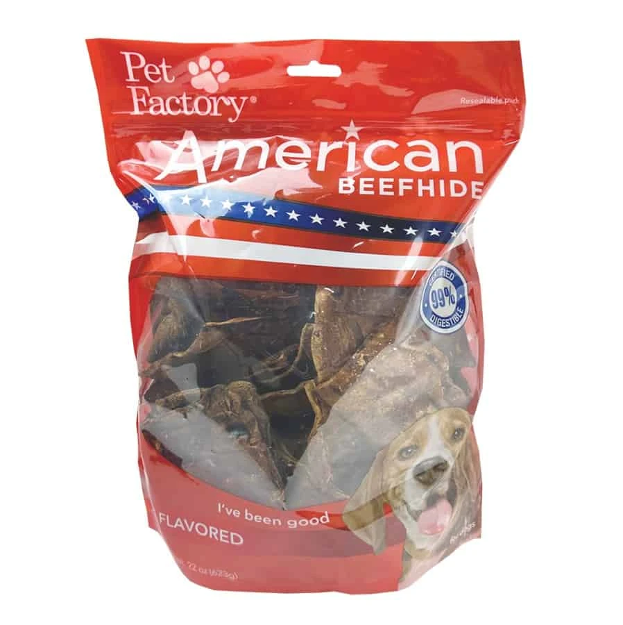 Pet Factory’s natural American beefhide chips are made from premium quality hides that helps keep your dogs teeth and gums healthy and clean. Your dog will enjoy the rich flavor of our beef flavored chips.