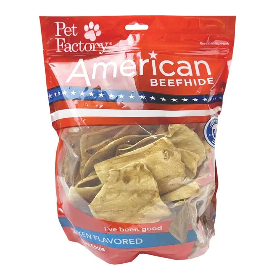 Pet Factory’s natural American beefhide chips are made from premium quality hides that helps keep your dogs teeth and gums healthy and clean. Your dog will enjoy the rich flavor of our chicken flavored chips.