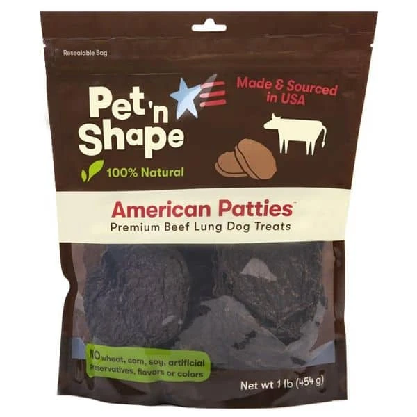 Pet ‘n Shape American Patties are 100% natural and contain only four, simple Ingredients including beef lung sourced from America’s heartland. American Patties can easily be broken up into smaller pieces for any sized dog, served up as reward, utilized as a training tool, or tossed around for a tasty game of fetch.