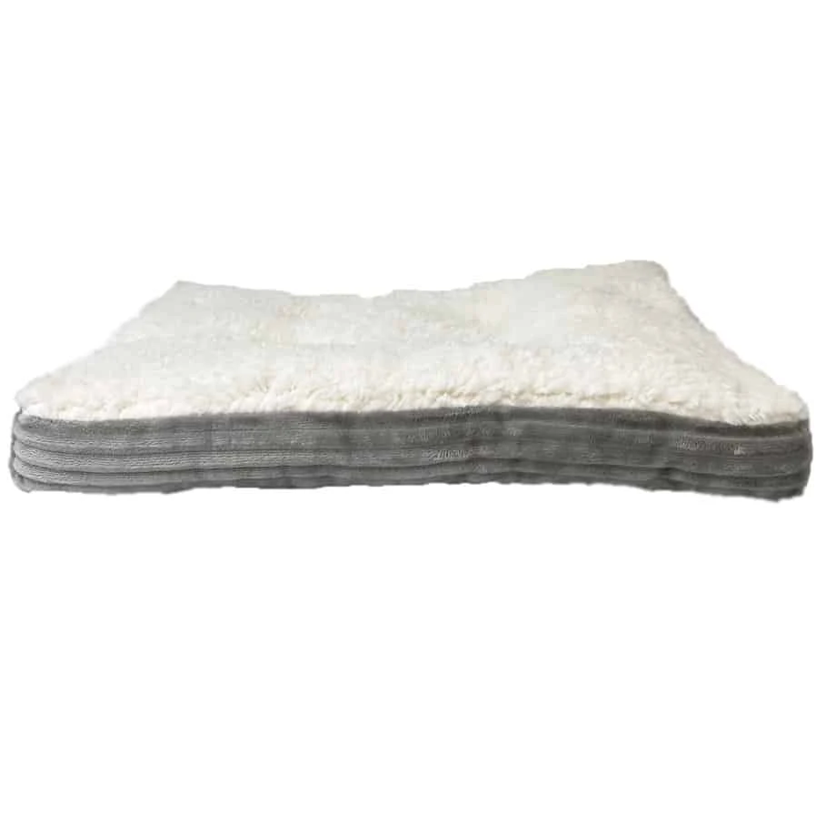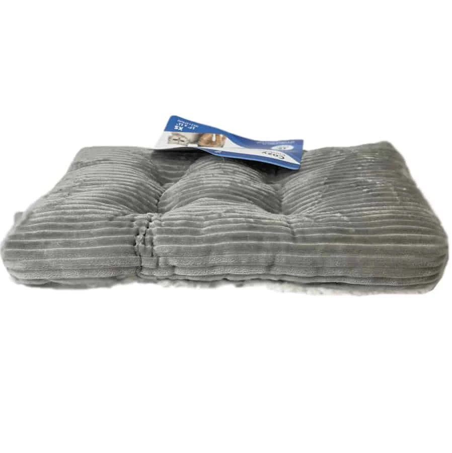 The Petcrest Sherpa & Corduroy Crate Mat fits perfectly in your standard dog kennel crate. Features an ultra soft, sherpa topper and smooth gray corduroy on the reverse side with plush stuffing inside to keep your pet snuggly and warm while in their resting area.