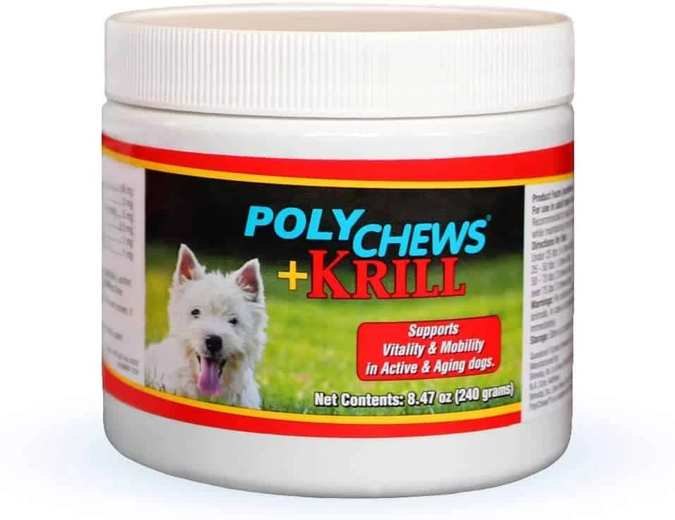 - Balanced supplement with Beta Glucans to support overall health and immunity for dogs of all ages. Highly-concentrated source of Glucosamine, Chondroitin and MSM for joint support and lubrication. Contains Krill, Omega-3 fatty acids for cell protection and brain, heart, joint and skeletal support. Ideal supplement to support adult dogs with achy hips and joints, active dogs and growing puppies. Great-tasting liver-flavored chew with added vitamins and minerals like Calcium, Magnesium and Zinc.
