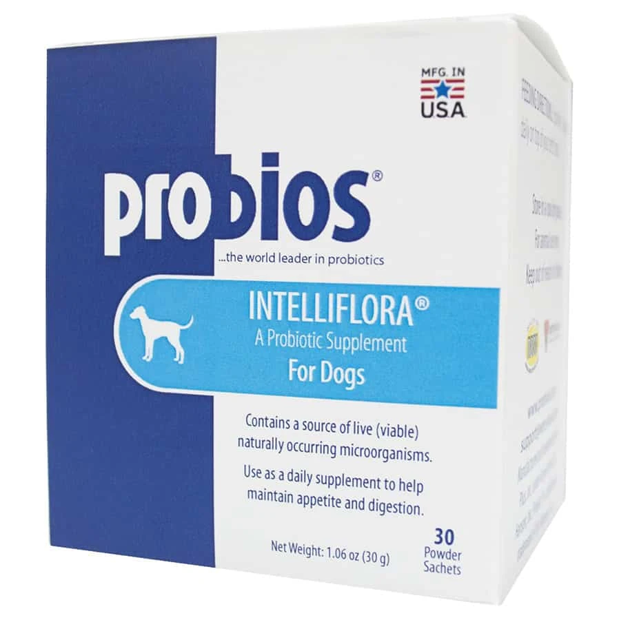 Probios Intelliflora contains four live, active strains of beneficial, naturally occurring microorganisms and soluble prebiotic fiber. The probiotics support appetite, help maintain proper digestion, and promote a healthy intestinal balance. The live active cultures in Probios Intelliflora are recommended for the dietary management of dogs with diarrhea. Daily use helps support proper digestion and normal stool consistency. Probios intelliflora may help manage diarrhea caused by stress, boarding, diet change, consumption of inappropriate food, antibiotic therapy, or soft stools. Sprinkle one 1 gram packet over your dog’s food each day.