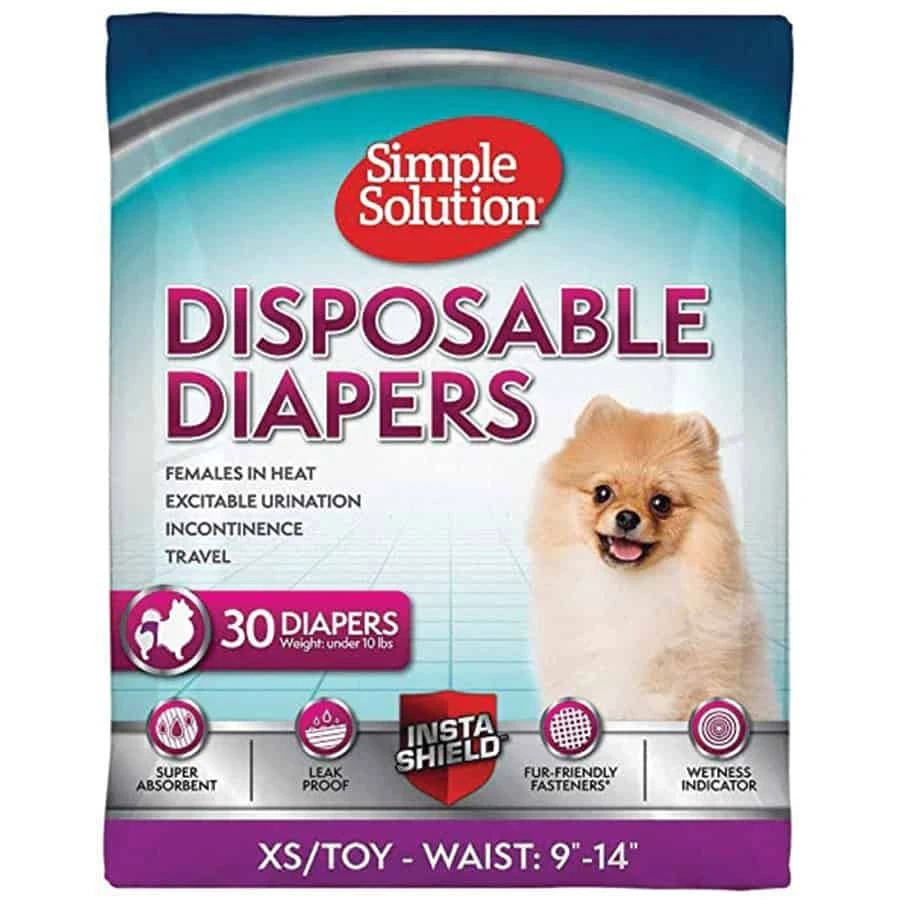 - A better fit – Simple Solution XS Disposable Dog Diapers with new adjustable fit sizes are for female dogs with a 9-14 inch waist. These female dog diapers feature a stretchable fabric that fits snugly around your pet.