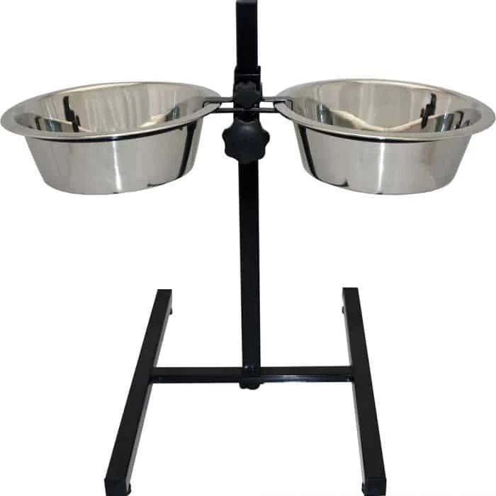 Stainless steel bowls included with black bracket stand. Adjustable from 4″ up to 18″. The H-Base design for stability. Locking bracket holds dishes in place. Overall width including the bowls is about 19″ and 10″ deep.