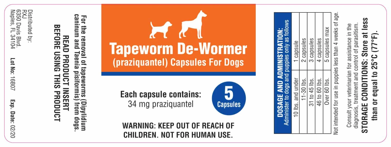 Tapeworm De-Worm capsules for dogs. Active Ingredients: 34 mg Praziquantel for the treatment of Tapeworms. For dogs 4 weeks and older.