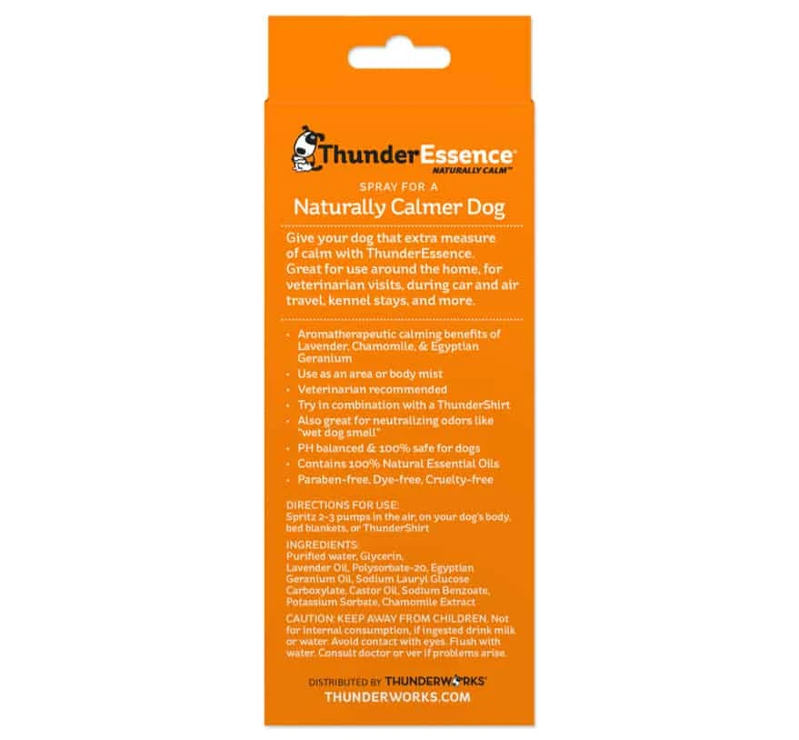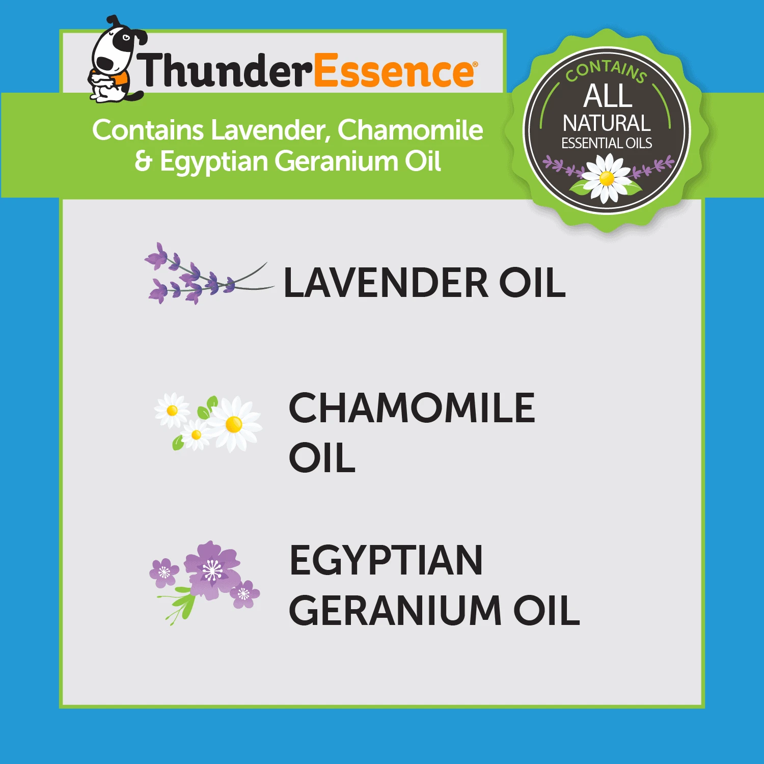 ThunderEssence is a calming essential oil made specifically for dogs. It contains 100% natural essential oils from Lavender, Chamomile and Egyptian Geranium. These oils are widely used in aromatherapy for a wide variety of calming and health benefits for both humans and dogs. ThunderEssence is great for use at home, for veterinarian visits, during car or air travel, kennel stays, and more. Our essential oils are completely safe for dogs! Give your pup that extra measure of calm with ThunderEssence Calming Essential Oils!