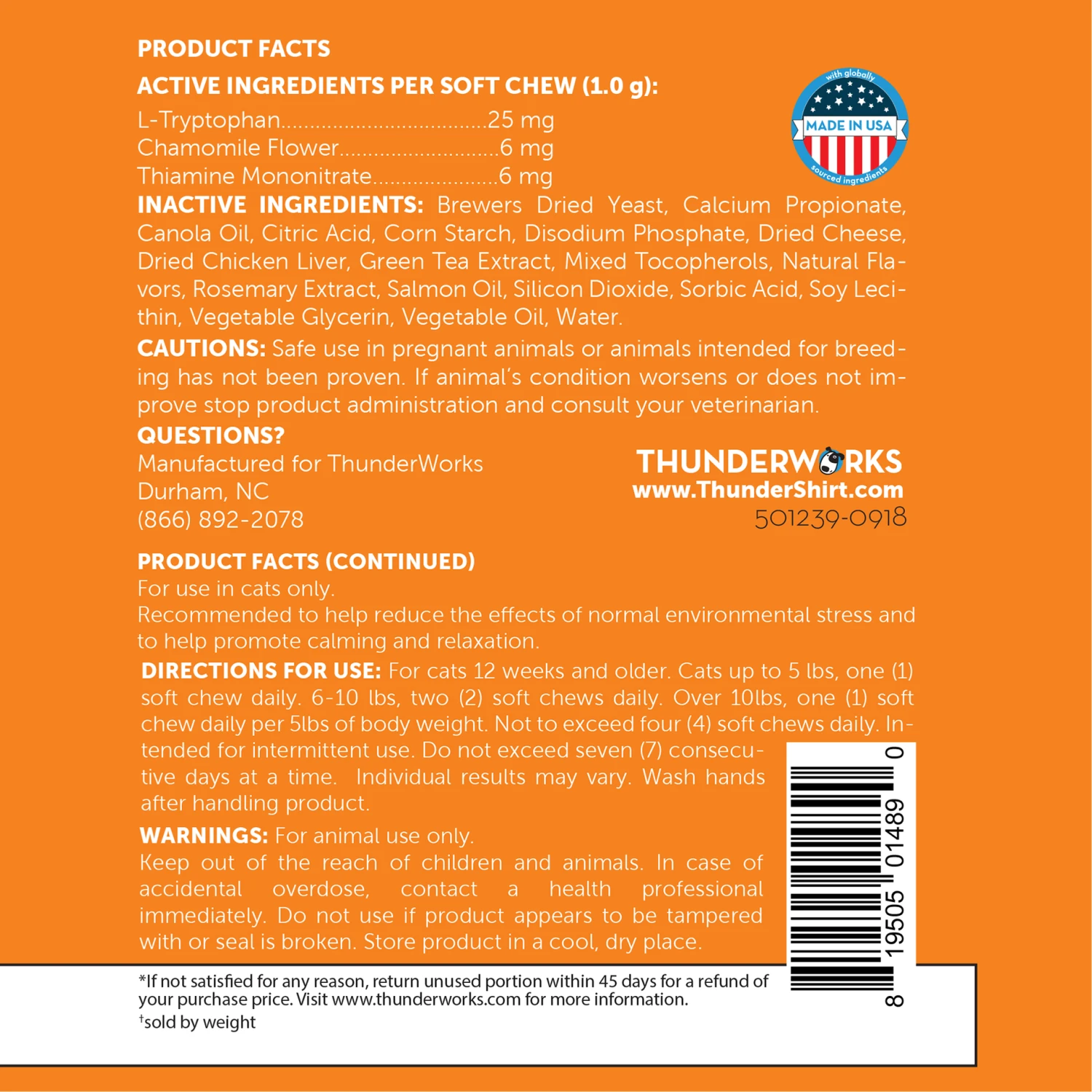 - ThunderWunders Calming Cat Chews are easy to use, vet recommended solution to help cats manage normal stress, and situations that cause anxiousness. Great for vet visits, travel, visitors, changes in the home, fireworks, thunderstorms, separation anxiety and more. Calming ingredients include L-Tryptophan, Chamomile Flower, and Thiamine. Our chews are cat taste test approved – we offer a finicky feline flavor guarantee.