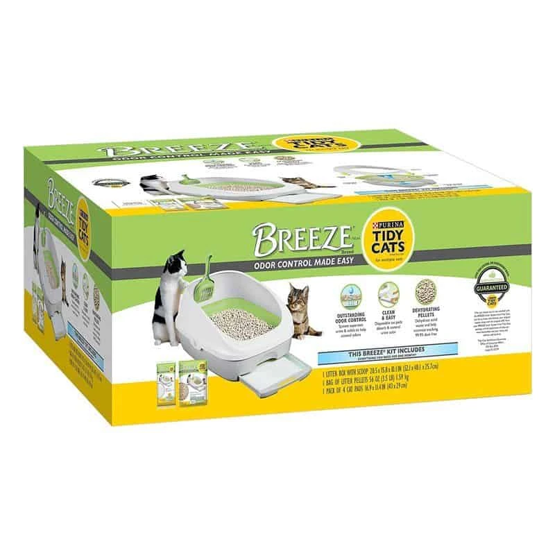 Kits comes with: Breeze litter box, (1) litter scoop, (1) 3.5 lb bag of Breeze litter pellets, (4) Breeze pads