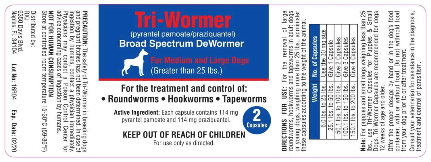 A broad spectrum dewormer for the removal of roundworms (Toxocara canis, Toxascaris leonina), hookworms (Ancylostoma caninum, Ancylostoma braziliense, Uncinaria stenocephala) and tapeworms (Dipylidium caninum, Taenia pisiformis) in dogs and puppies. Each capsule contains pyrantel pamoate and praziquantel for effective treatment. Recommended for dogs 12 weeks of age or older. Made in USA.