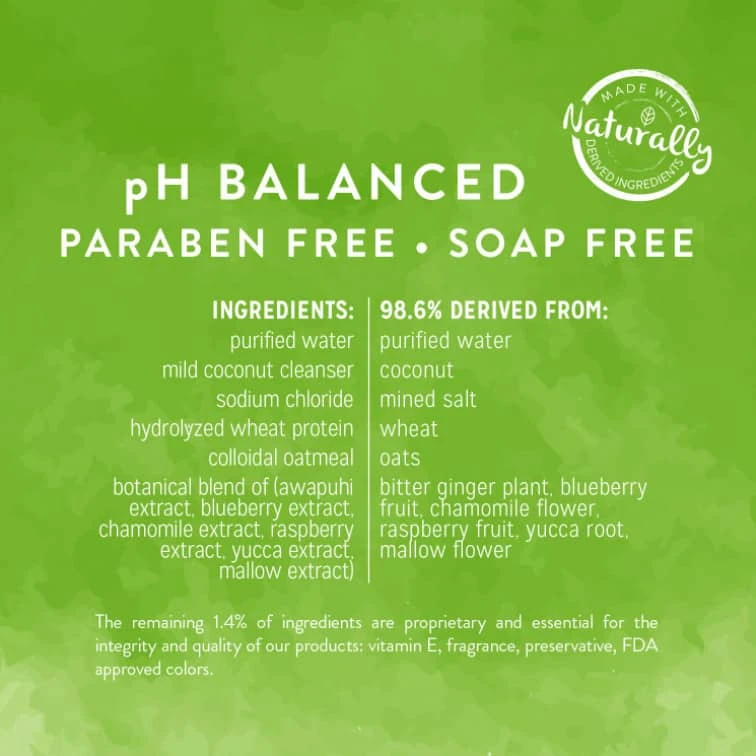 - All natural, pH balanced and contains no soap, parabens or dyes.