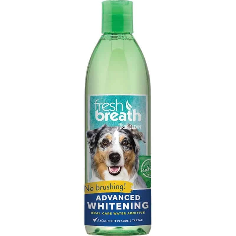 - Fresh Breath by TropiClean Oral Care Advanced Whitening Water Additive provides defense against plaque & tartar and noticeably fresher breath in 14 days or less with daily use as directed. Results may vary. Oral Care Advanced Whitening Water Additive is formulated with a unique blend of ingredients including green tea that help fight bacteria that cause bad breath and provide up to 12 hours of fresh breath. Is tasteless and odorless, and helps freshen breath when added to your dog’s water with each refill. No brushing required! Advanced Whitening formula with 3D Microguard helps fight bacteria that cause plaque buildup.