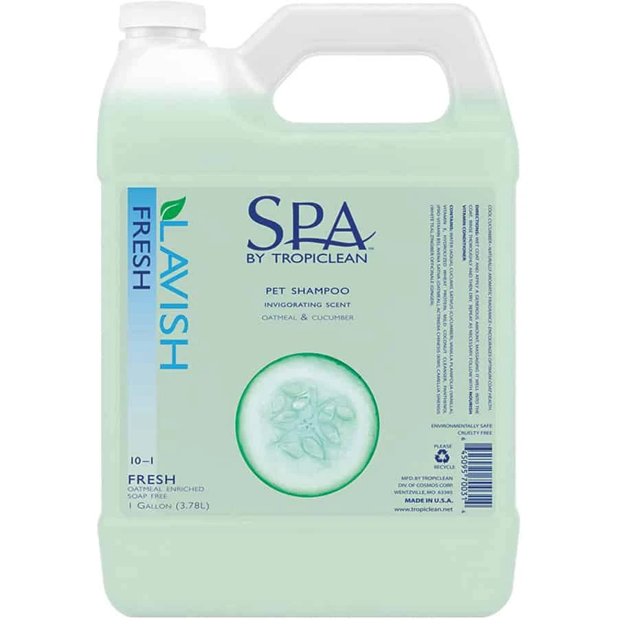 SPA Fresh pet shampoo is made with refreshing cucumber, white tea, and fresh vanilla offer purifying properties to boost circulation and help combat the effect of toxins. Dead skin cells are washed away, and your pet’s coat will immediately be naturally radiant, nourished, and healthier. Your pet’s SPA Fresh bath will be deep cleansing, refreshing, and naturally aromatic. Lavish your pet with SPA by TropiClean Fresh shampoo!