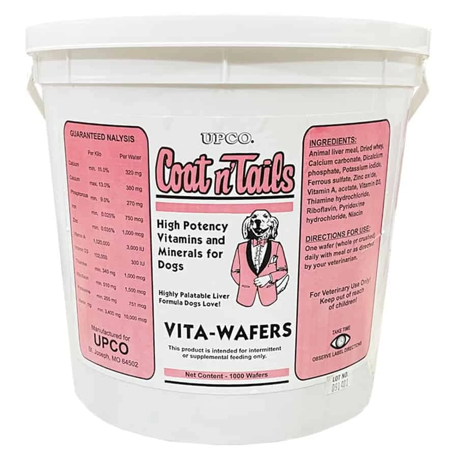 UPCO Coat N’ Tail Vita-Wafers are a high potency, vitamin & mineral chewable wafer for dogs. Vita-wafers Super strength high potency vitamins and minerals come in tasty chewy wafers that will please any dog. Plus, they’re much less expensive than Pet-Tabs® and 2-3 times stronger than many on the market.