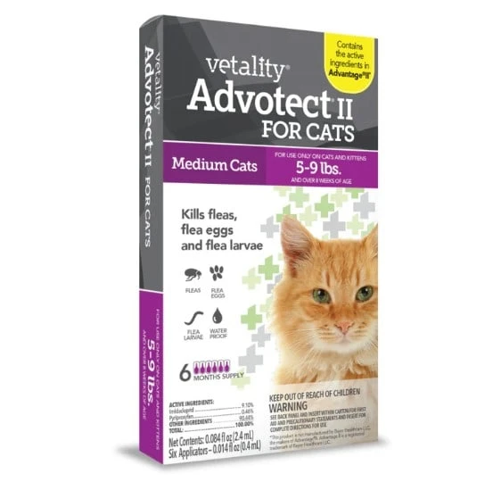 Advotect™ II for Cats effectively prevents and kills all stages of the flea lifecycle: fleas, flea eggs and larvae. It offers the same level of protection as products available from your vet. Compare this affordable and effective product to Advantage® II for Cats.* Advotect II™ is available in a six-month supply for superior protection.