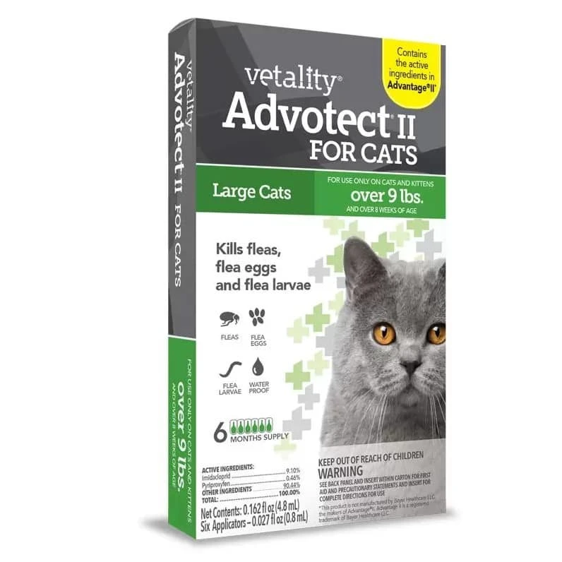 Advotect™ II for Cats effectively prevents and kills all stages of the flea lifecycle: fleas, flea eggs and larvae. It offers the same level of protection as products available from your vet. Compare this affordable and effective product to Advantage® II for Cats.* Advotect II™ is available in a six-month supply for superior protection.