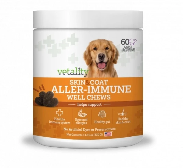 Vetality Skin & Coat Aller-Immune Well Chews for Dogs are a delicious way to support your furry friendās skin and coat health! Packed with omega fatty acids, these treats help reduce shedding, keeping your dogās coat looking shiny and healthy. Theyāre easy to digest, too, making them a perfect snack for pups of all ages.
